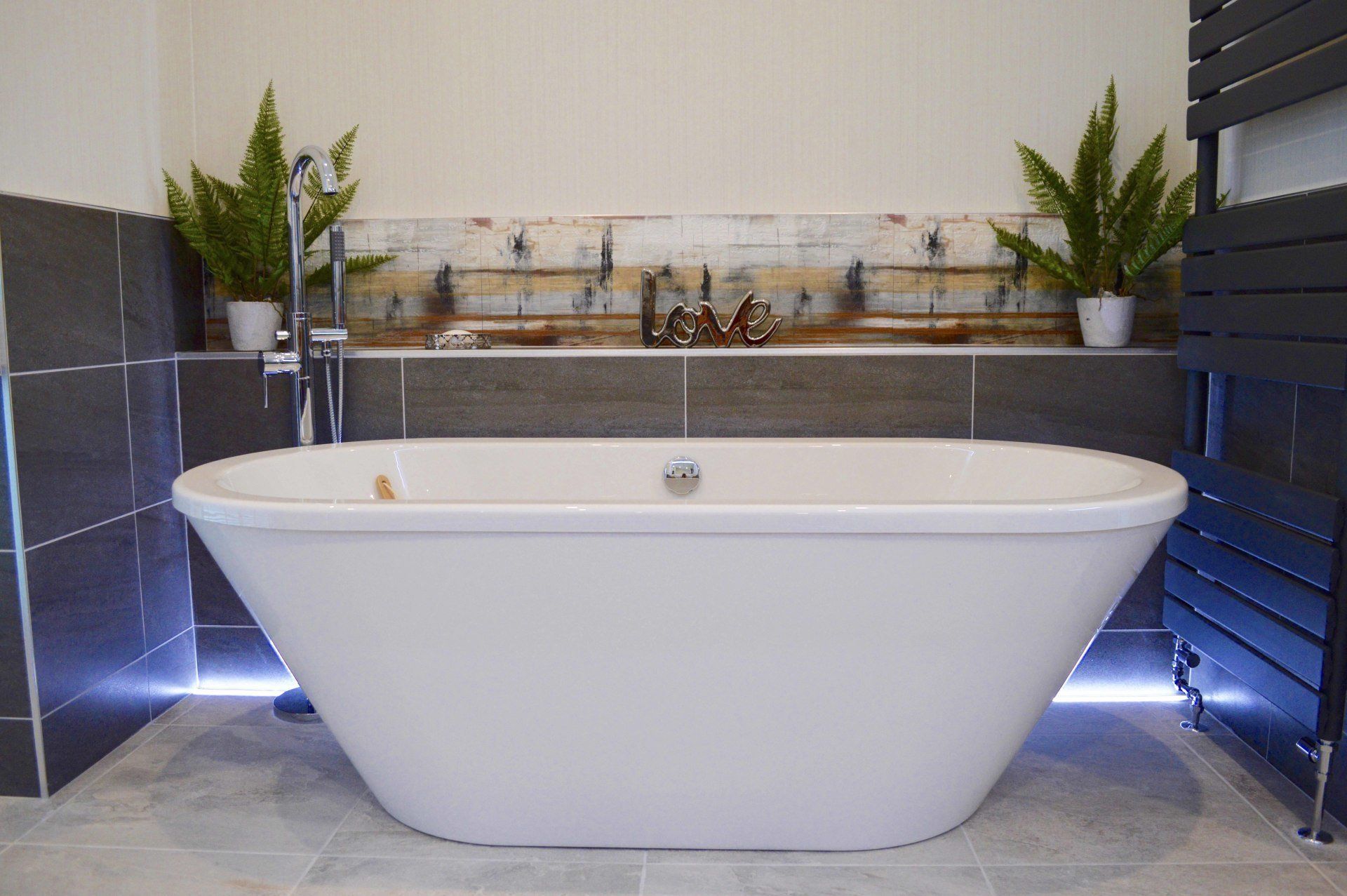 • Double-ended freestanding bath with floor-mounted chrome bath filler and floor-recessed LED strip light