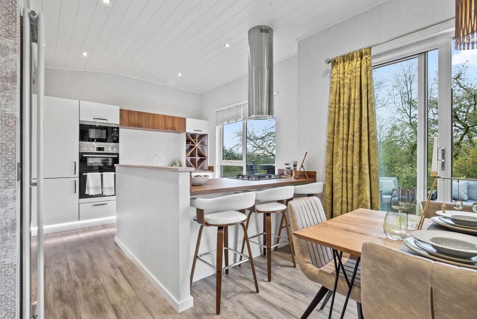 The inviting lounge forms a cosy space that is full of life. The bright and airy décor is punctuated by elegant walnut furniture. The simple and stylish designer kitchen opens up to floor-to-ceiling windows. The oversized windows and doors in the living areas are sheltered by a stunning overhanging exterior facade, which is delicately braced by striking Douglas Fir timbers with wall washer lights.