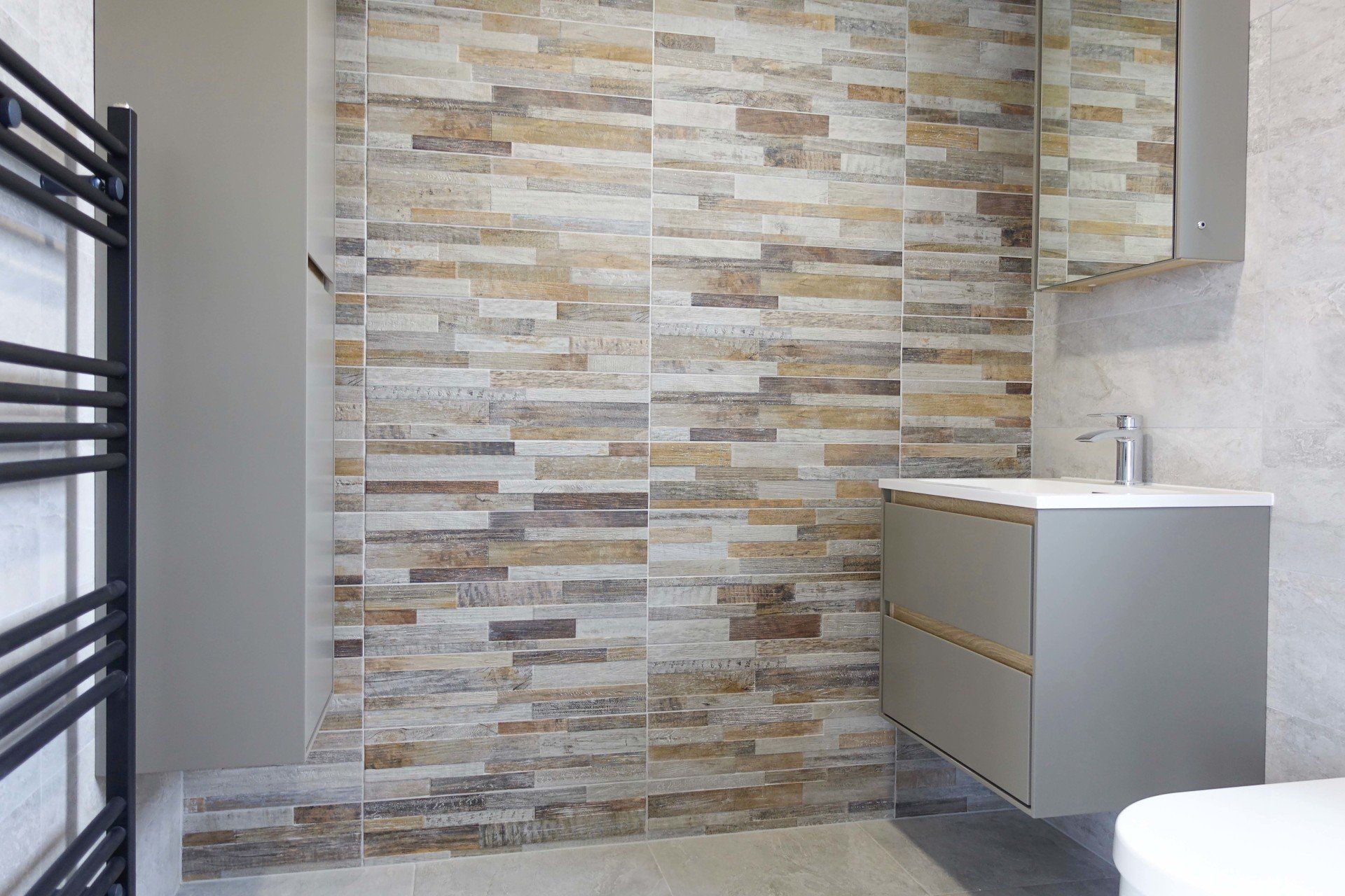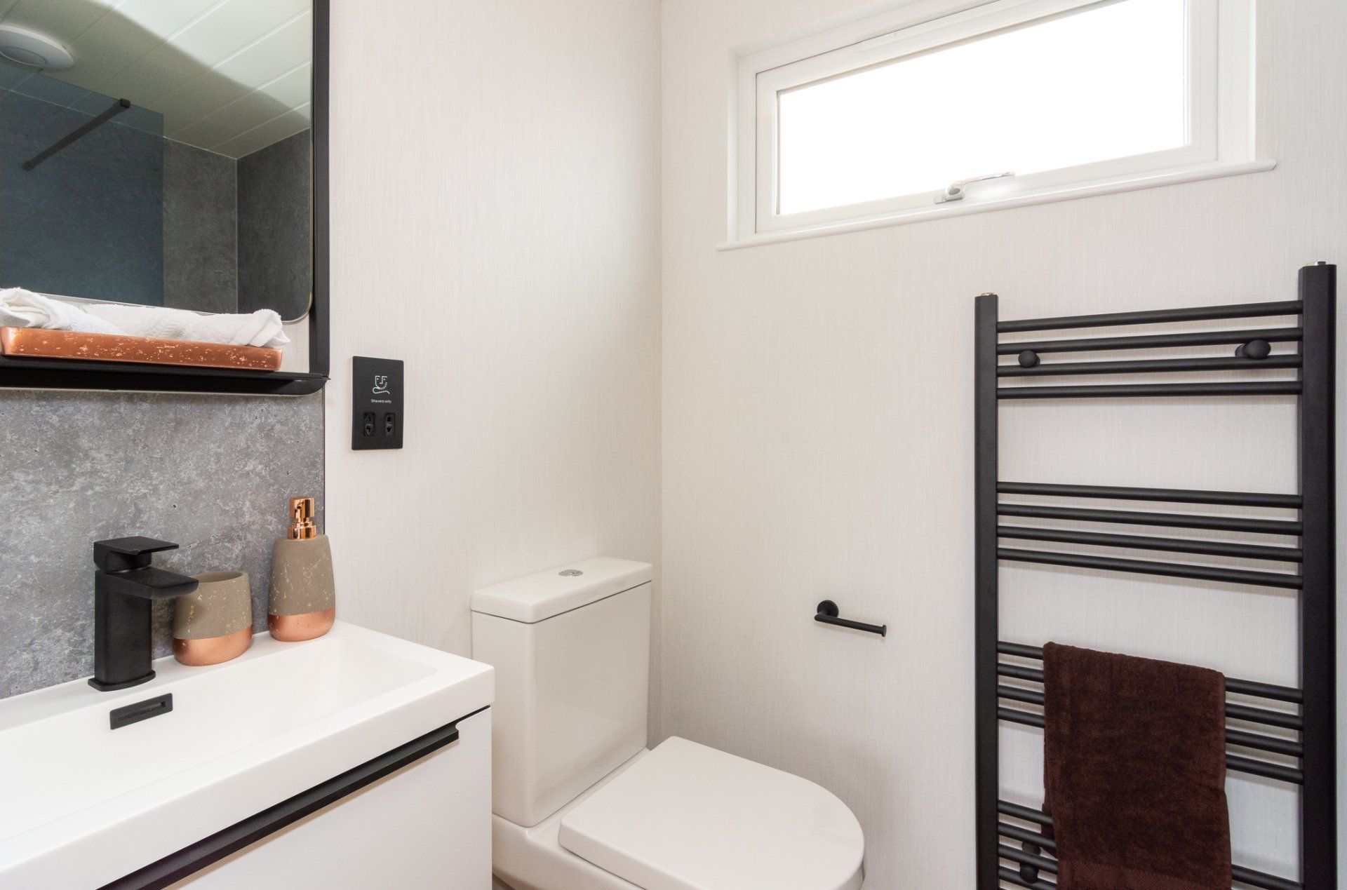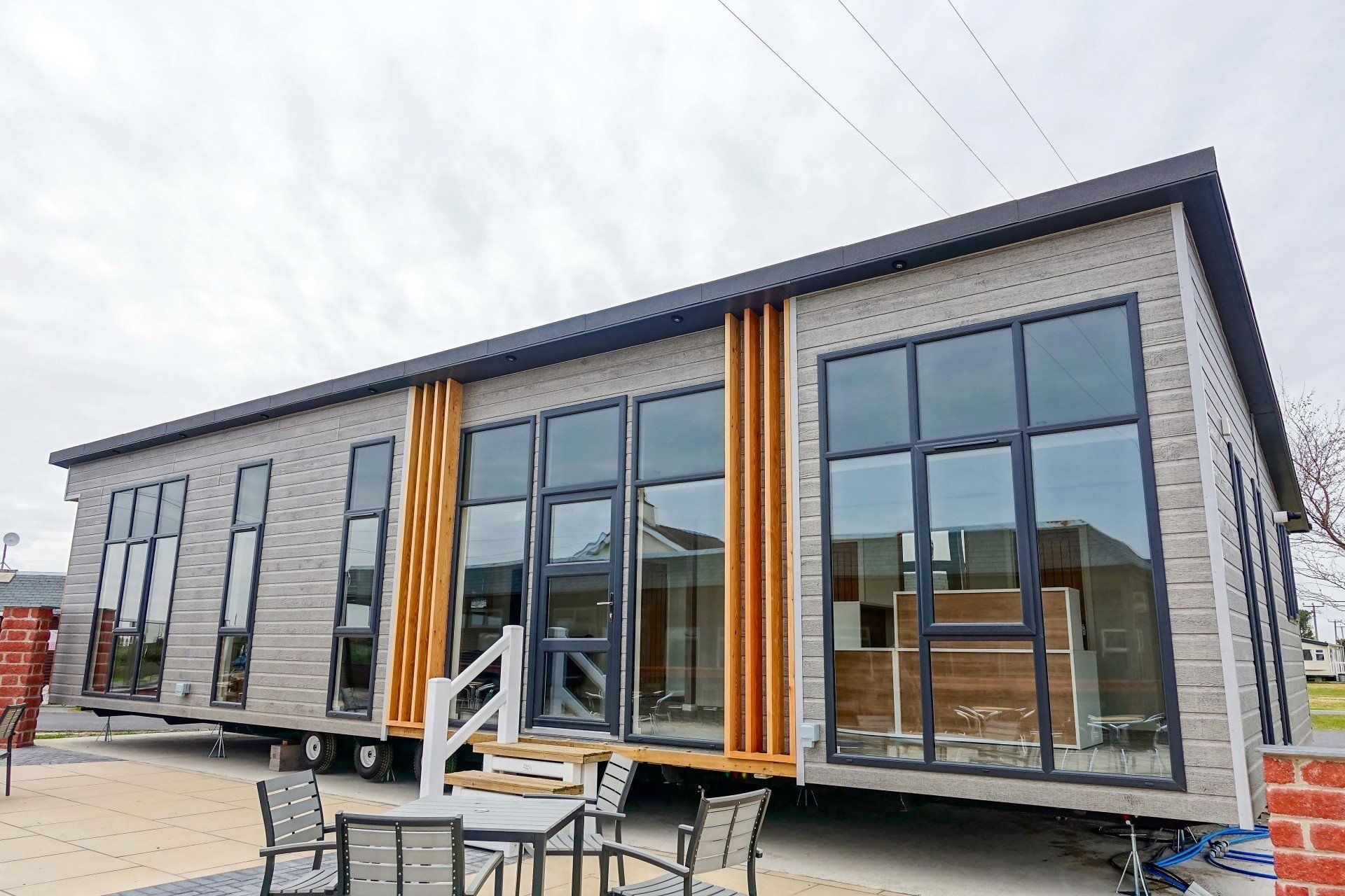 Everything about our sales and marketing suite is state of the art, from the feature slate walls and custom-made reception desk to the spacious laundry room with built-in shelving and the feature external timbers with up-lights.