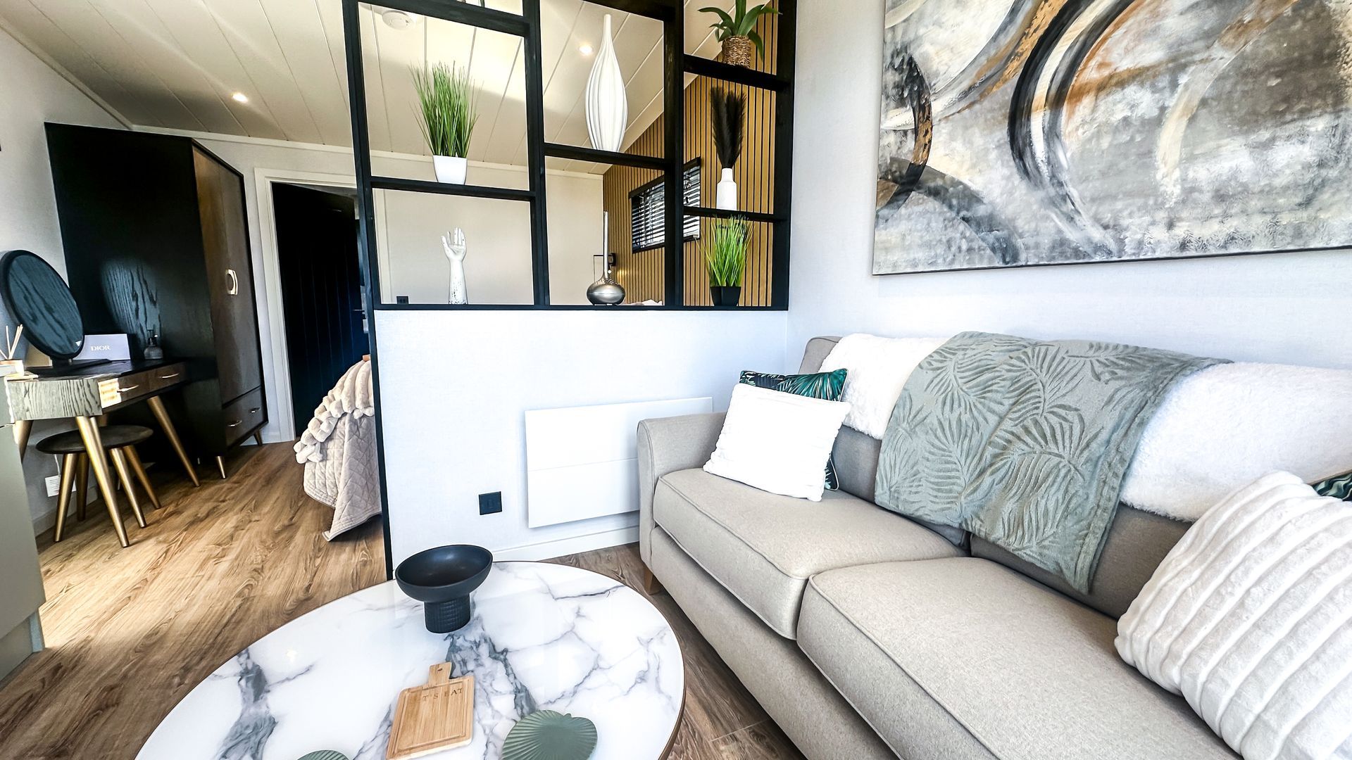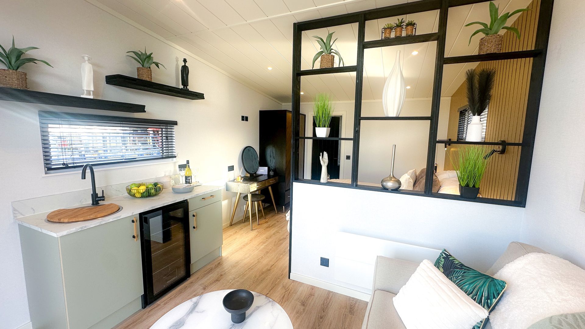 The Eden Pod takes a small space into the big leagues! The defined living space accessed by French doors to make the most of the views offers cosy seating alongside a practical kitchenette. A glamourous sleeping area boasts a king sized bed and plenty of storage space with a well appointed ensuite shower room. A range of exterior colours and cladding,