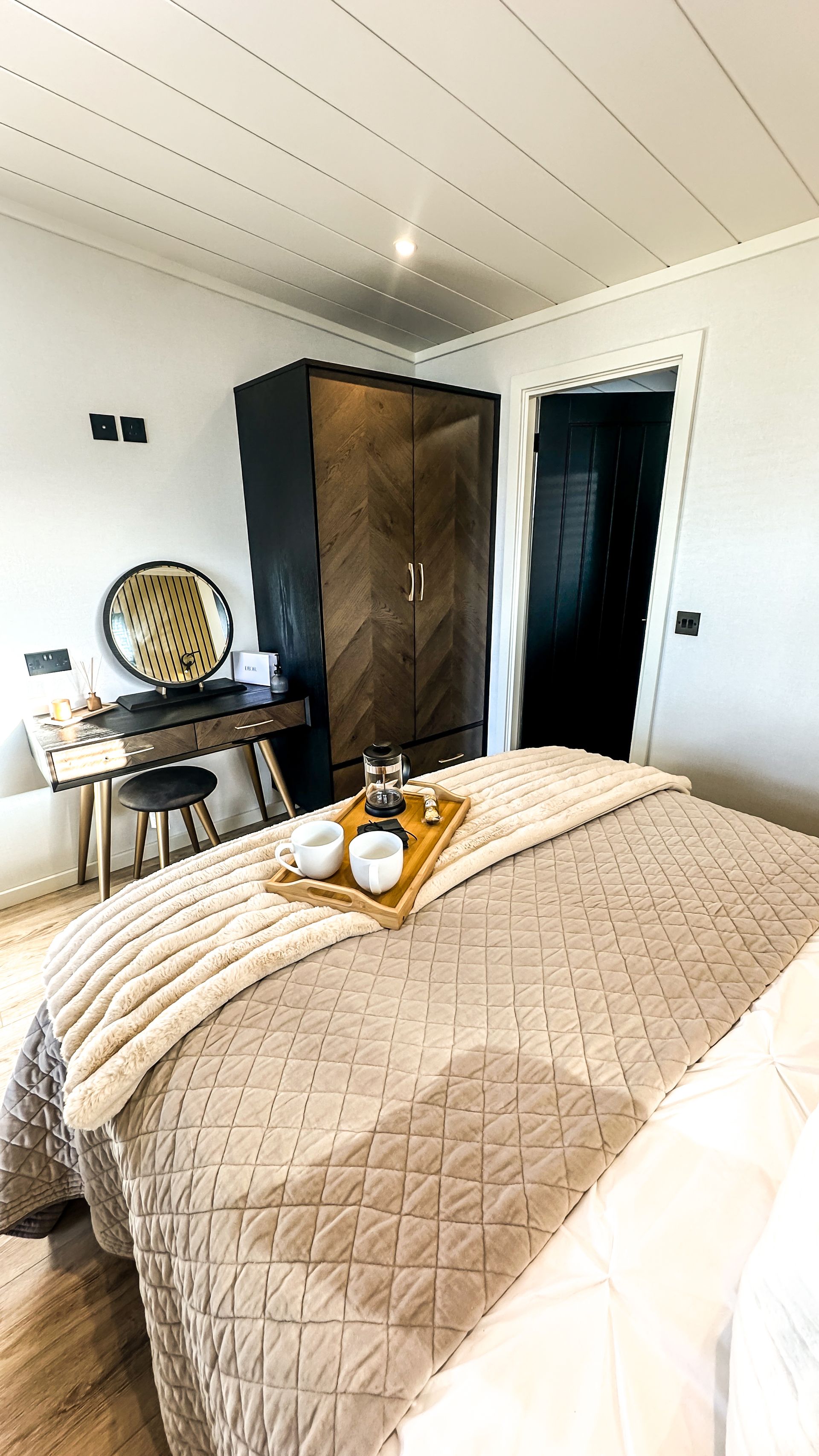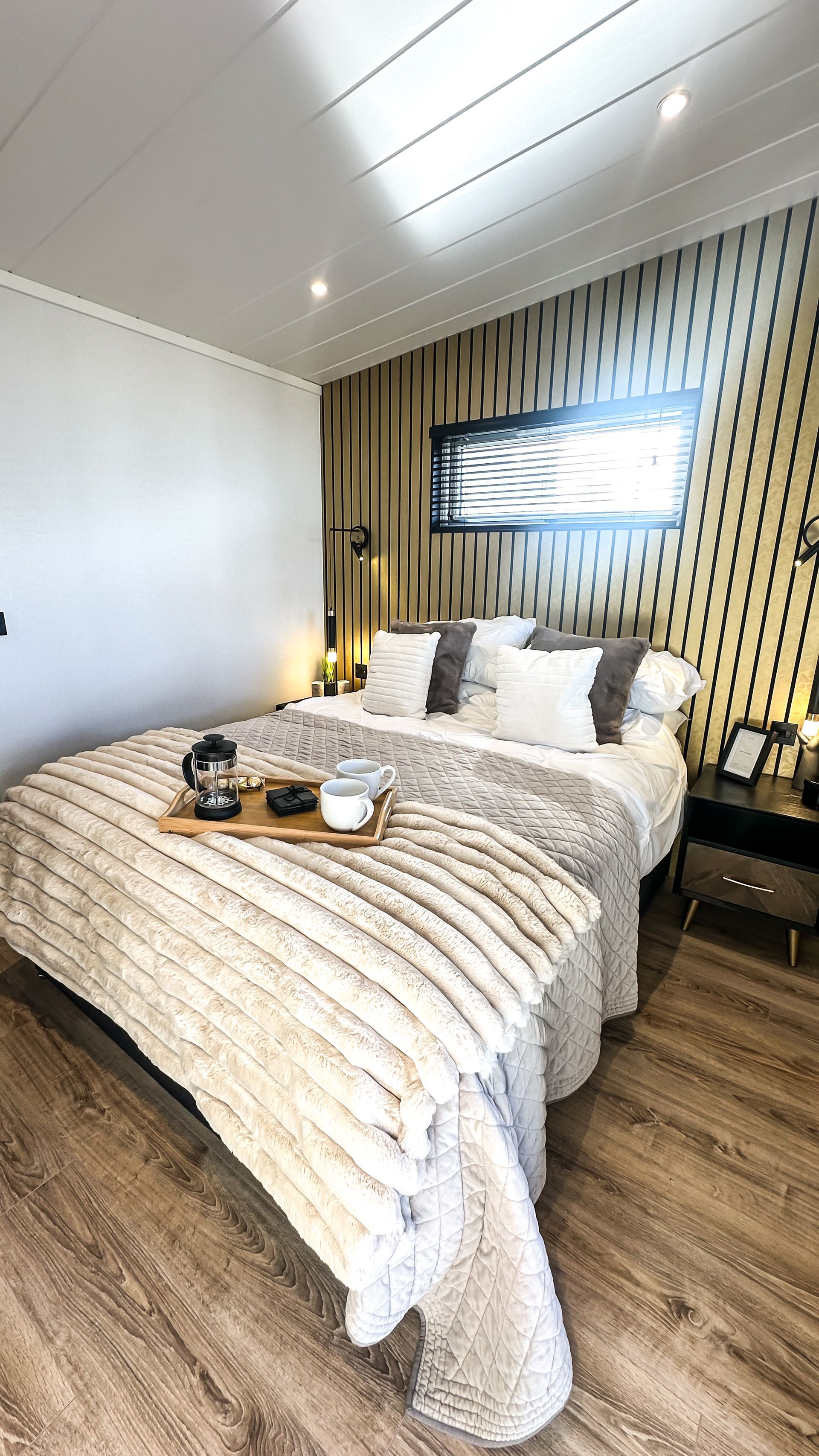 - Bedroom area includes king sized bed, bedside tables, wardrobe, dressing table and reading lights