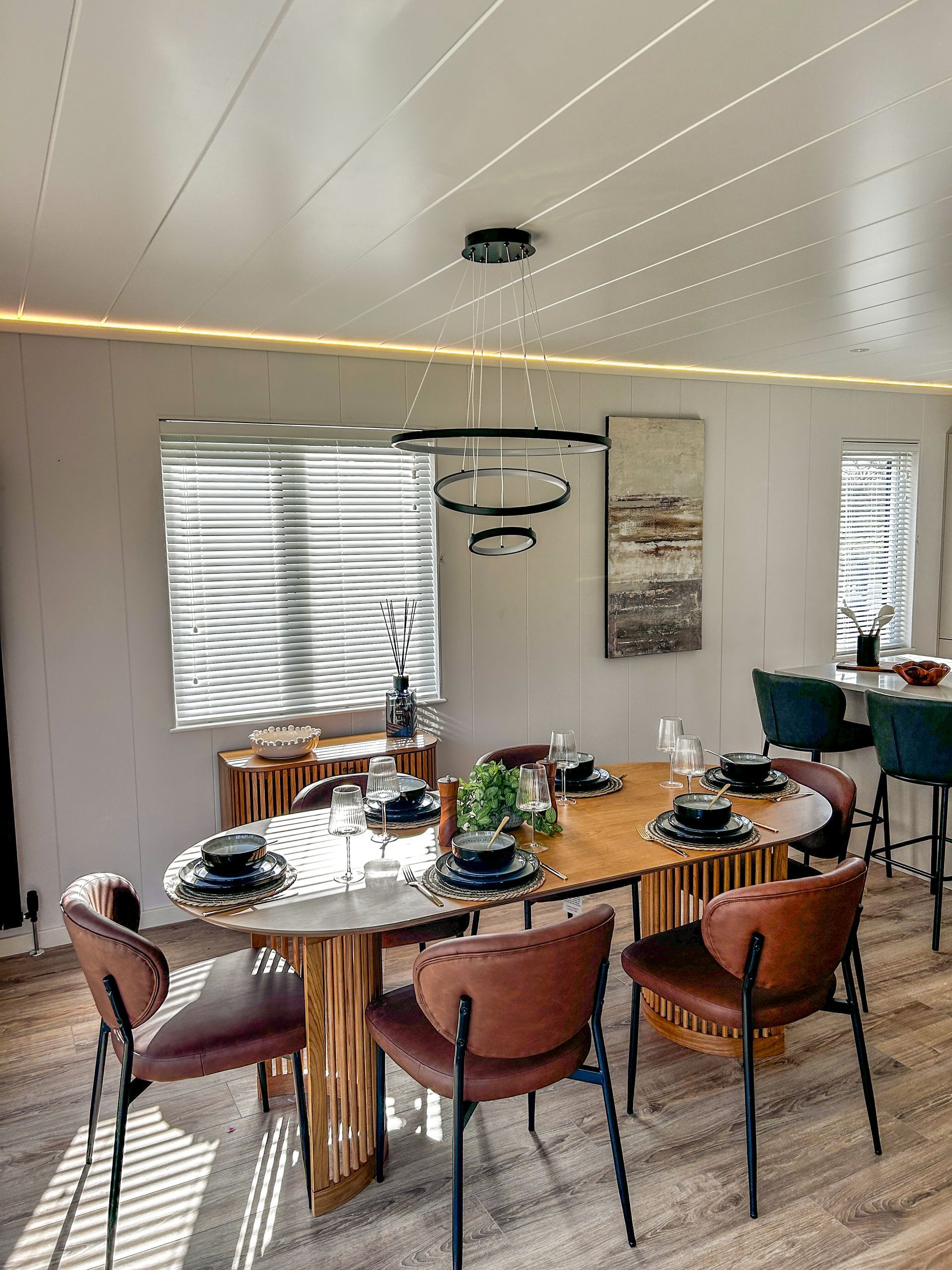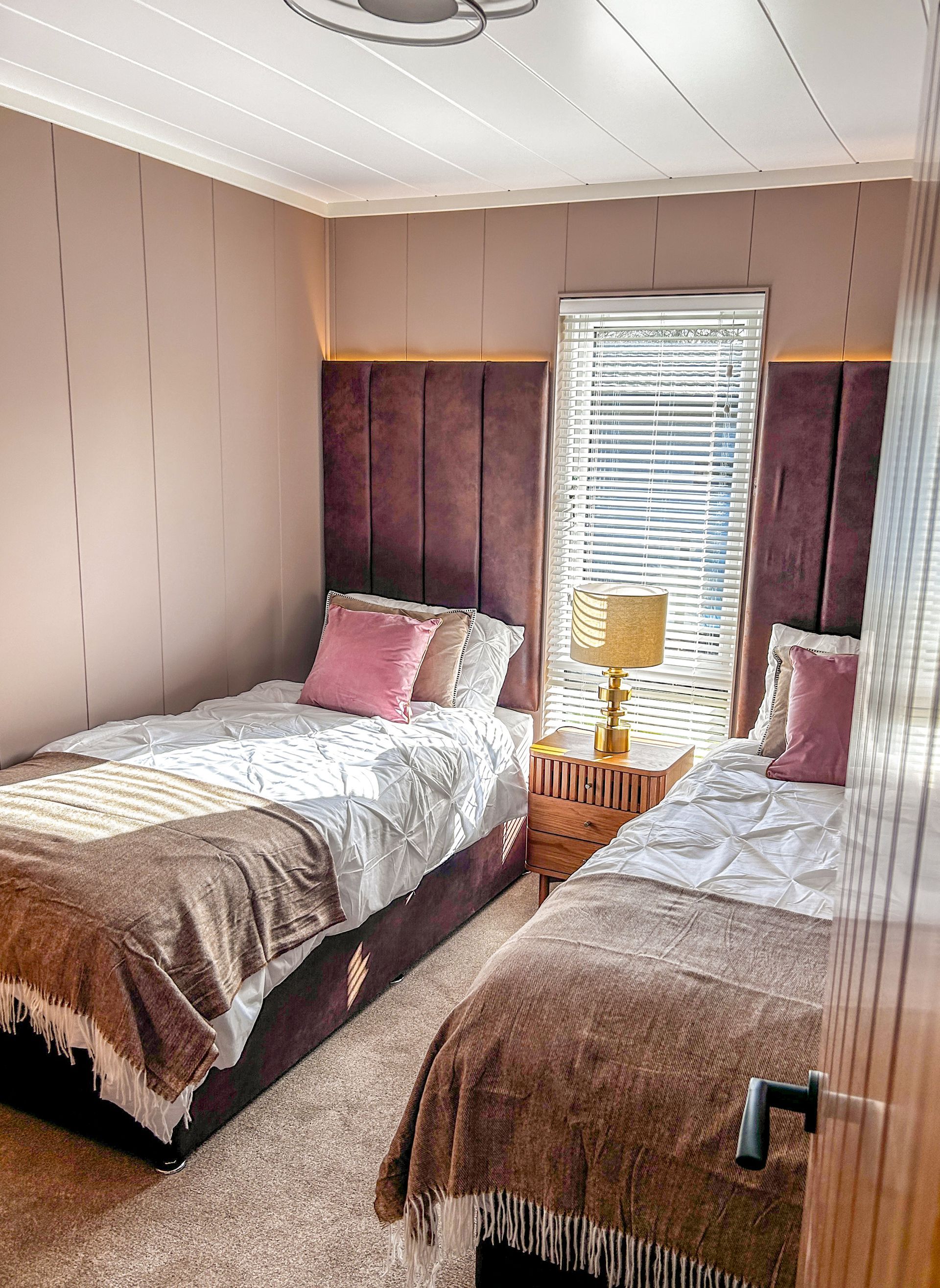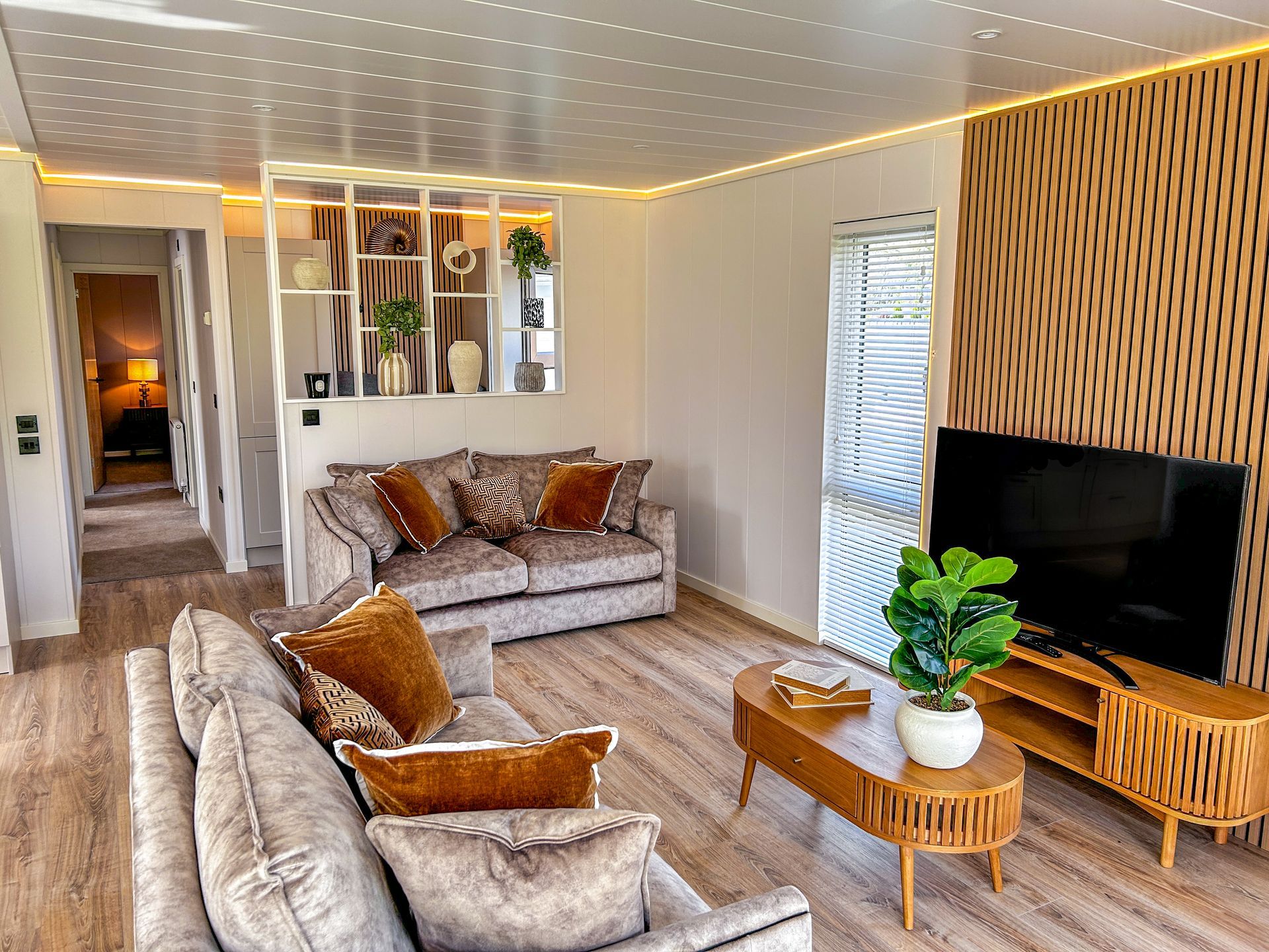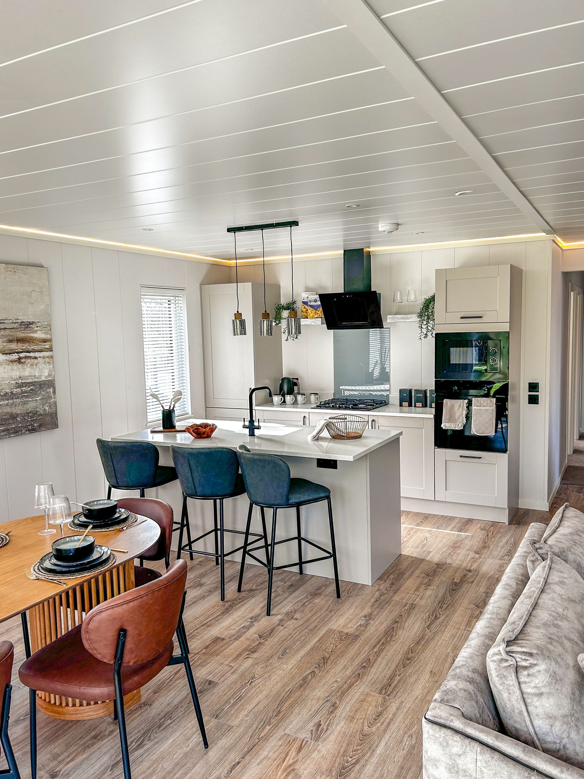At the heart of The Luma is its open‑plan kitchen, dining and living area, a spacious, sociable hub designed for modern holiday living. The beautifully crafted kitchen island anchors the space, offering a stylish focal point for cooking, gathering and entertaining. Natural yet bright earthy tones flow throughout, complemented by textured wall details, contemporary fixtures and a refined, modern finish.