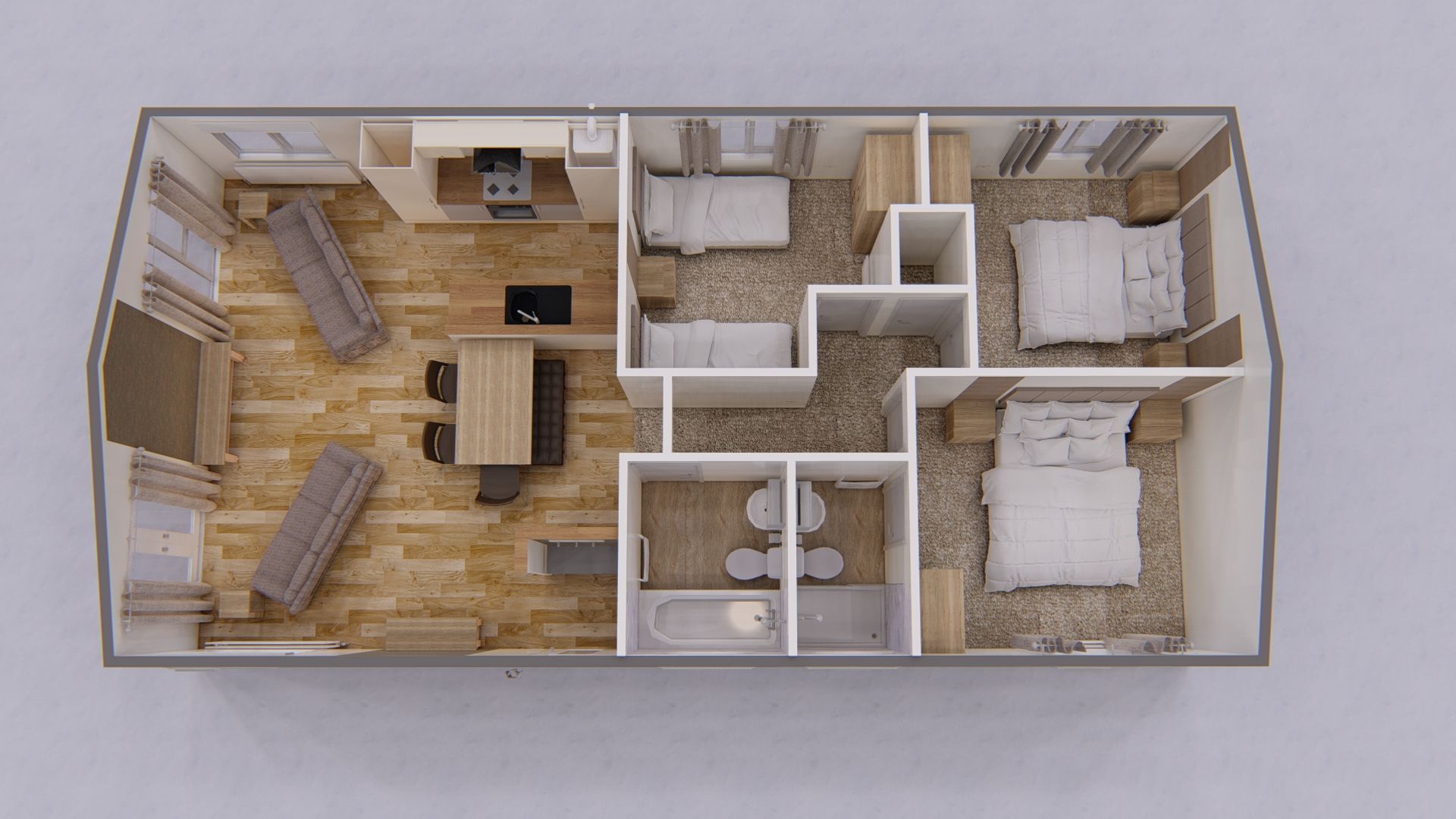 The Menai lodge is well laid out, with the sofas making the most of the stunning views and the kitchen and dining area being nestled at the heart of the home. The bedrooms arrangements offer flexibility and the ensuite master bedroom provides a touch of luxury. With warm colour schemes throughout, the Menai is the ideal lodge for your home from home.