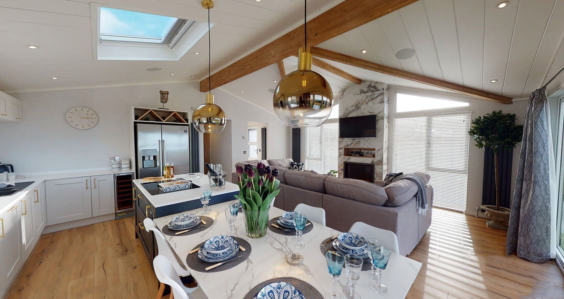 The lounge is soothing and elegant, featuring a dormer with timber beams to enhance natural light and space. A large U-shaped sofa, complemented by a feature footstool, takes pride of place in the lounge, alongside a stunning marble-effect tile chimney breast and inset electric fire.